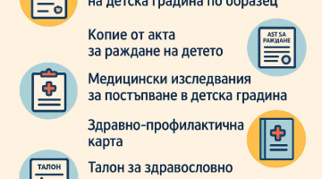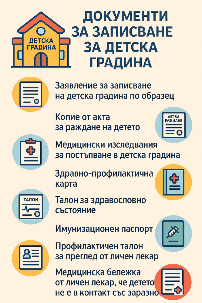 - Забележка: Всички медицински документи се подготвят непосредствено преди постъпване на детето в детската градина.