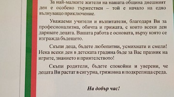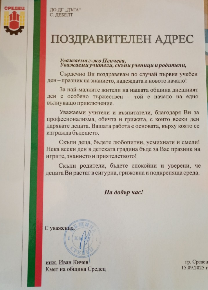 Учебна 24/25 - Поздравителен адрес от кмета на Община Средец-инж. Иван Кичев по повод концертът "Добротата е вълшебство", проведен на 21.05.2025 г. в читалище "Светлина"